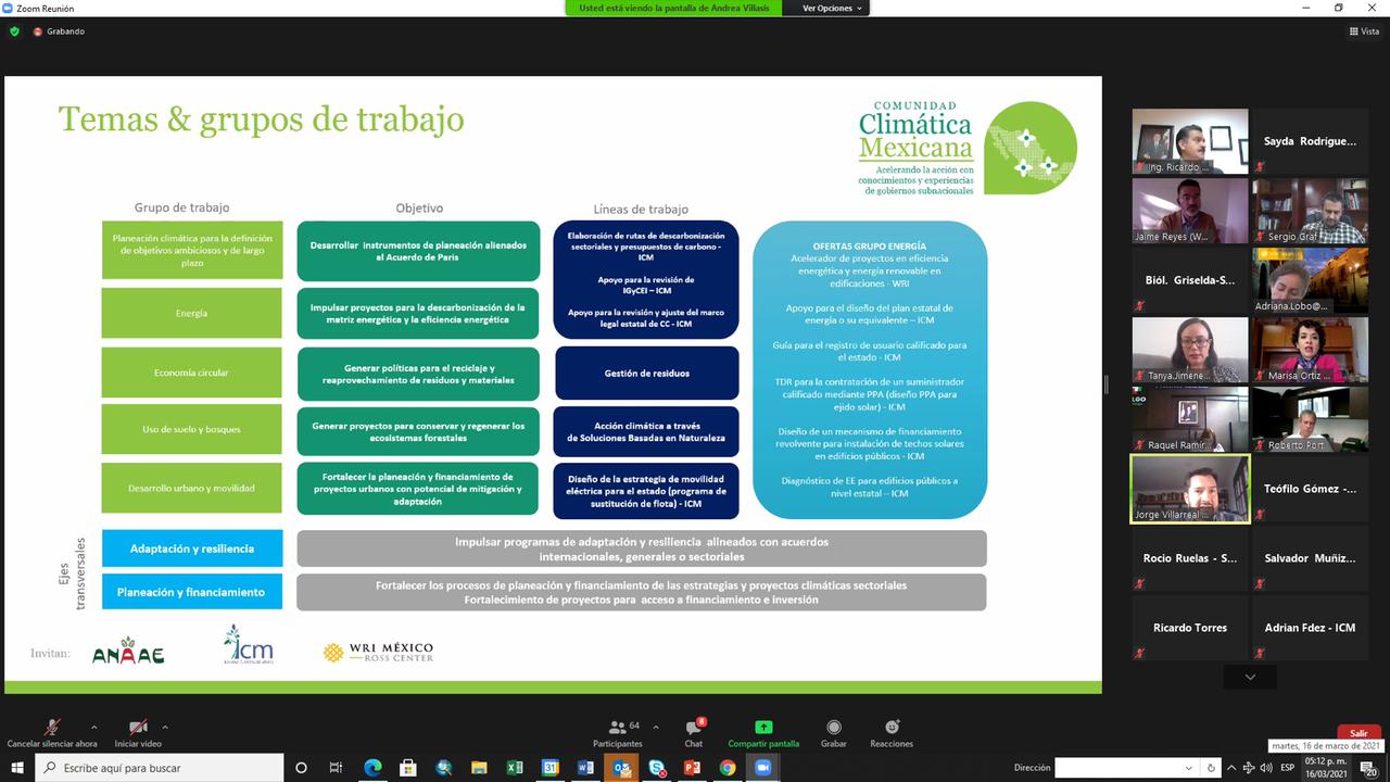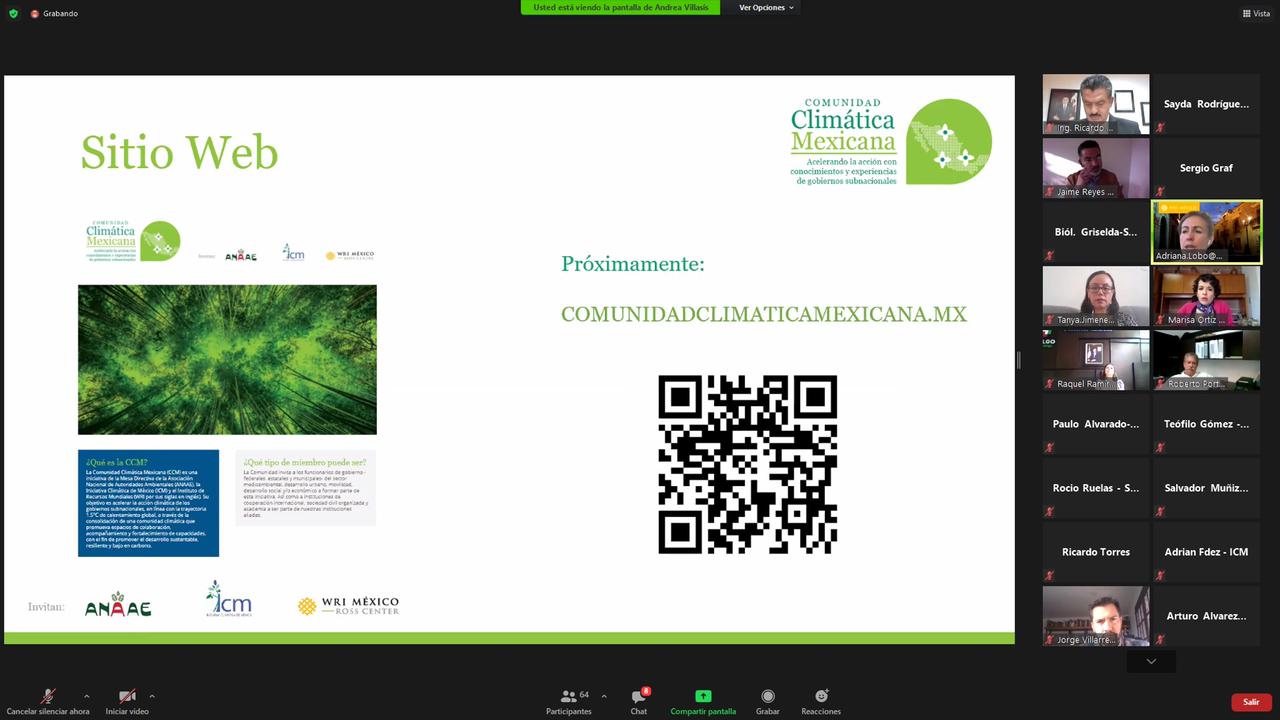 Mediante un webinar, inició esta propuesta de Mesa Directiva de la Asociación Nacional de Autoridades Ambientales (Anaae), la Iniciativa Climática de México (ICM) y el Instituto de Recursos Mundiales (WRI, por sus siglas en inglés), cuyo objetivo es generar alianzas para cumplir metas climáticas y consolidar la participación de actores tanto nacionales como internacionales, públicos y privados.
