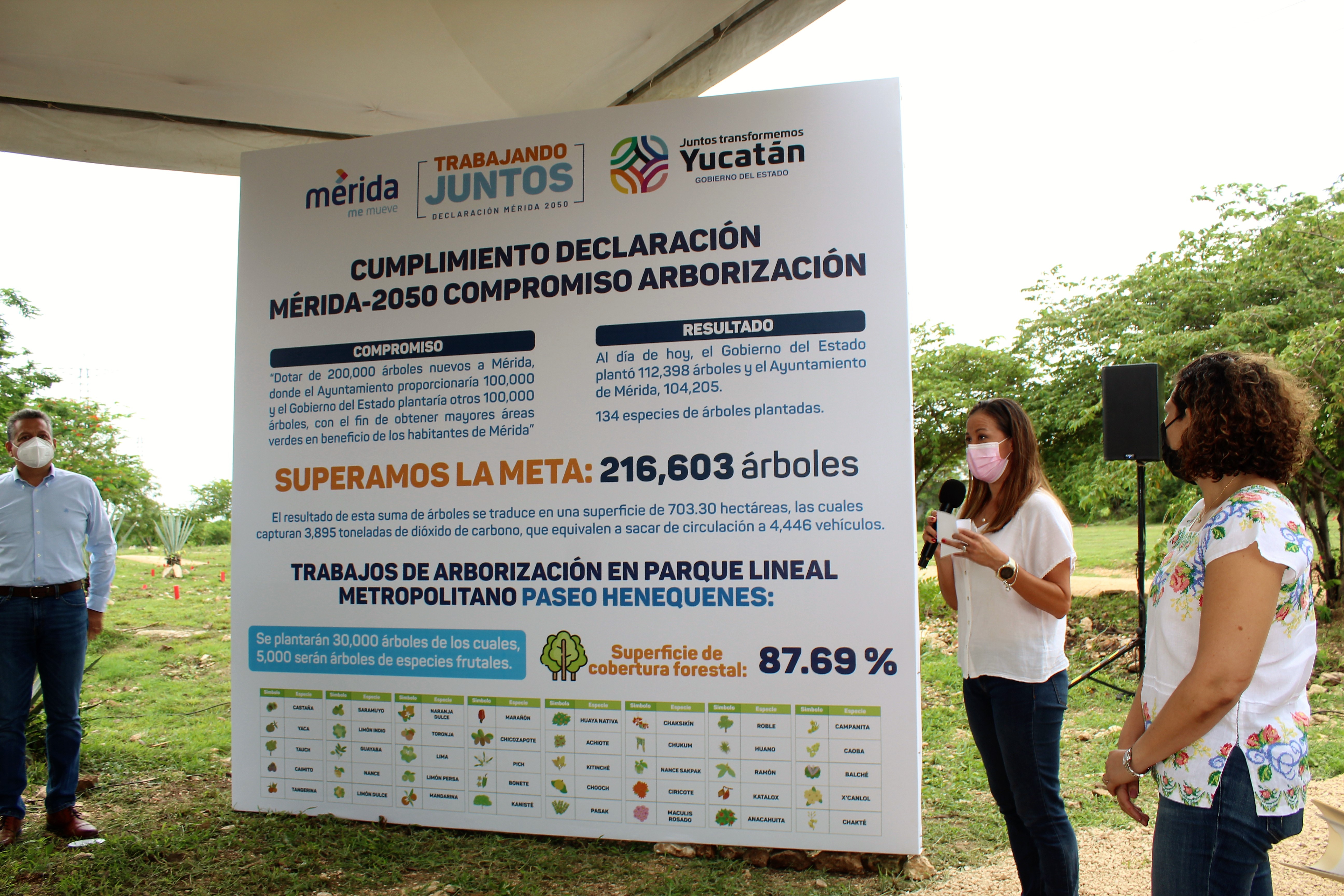 Como parte de este compromiso de arborización, el Gobernador anunció que se plantarán 30,000 árboles adicionales en Paseo Henequenes de los cuales, 5,000 serán árboles de especies frutales y con lo que este parque lineal contará con una superficie de cobertura forestal de más del 87%.