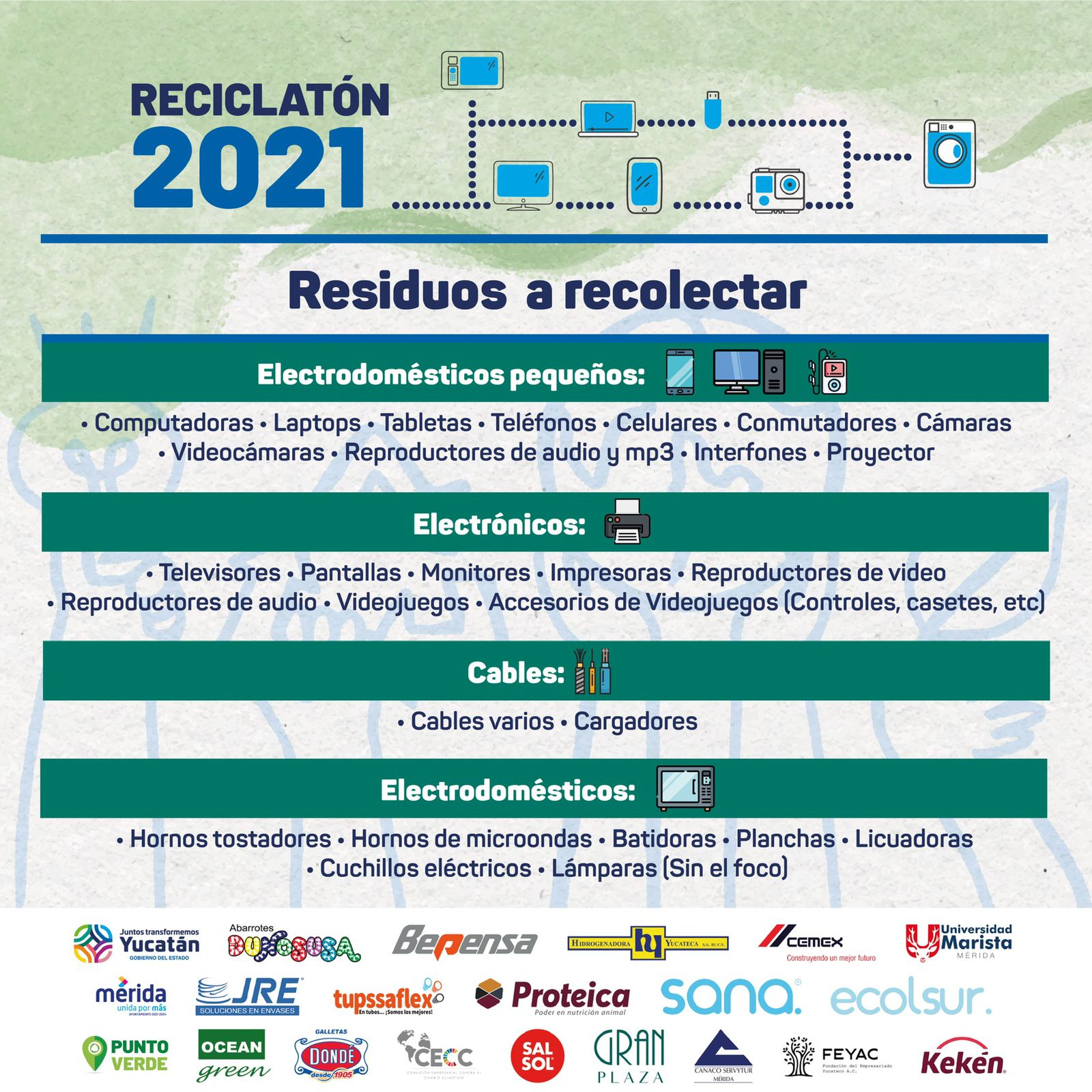 También, la Coalición Empresarial contra el Cambio Climático, que integran Bepensa, Isysa, Hidrogenadora, Cemex, Dondé, Kekén y Dunosusa, mientras que Tuppsaflex, Proteica, JRE, SANA, Oceangreen y Ecolsur se encargarán de la recolección y disposición adecuada de los residuos.