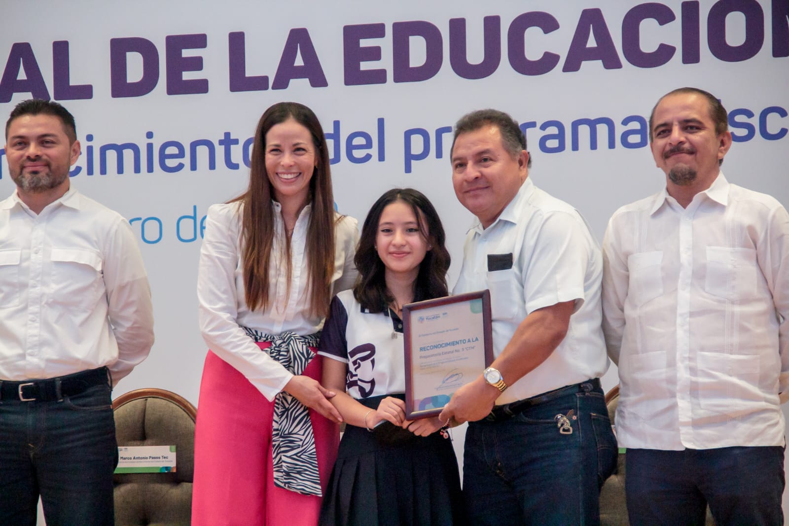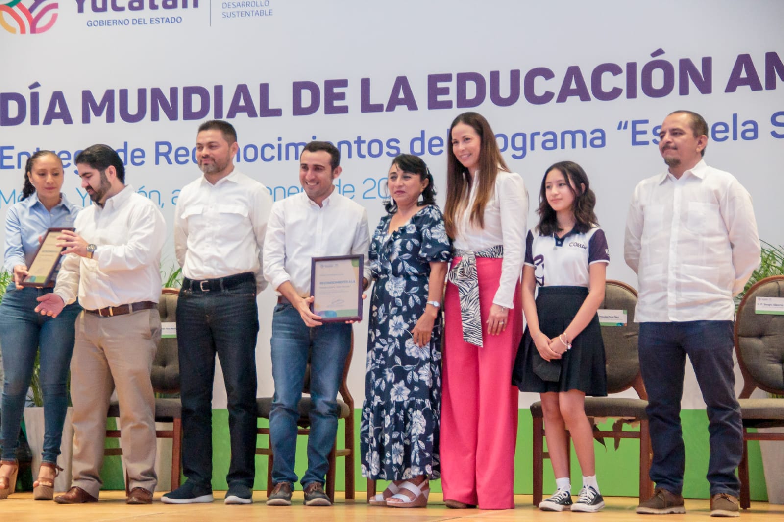 La titular de las Secretaría de Desarrollo Sustentable (SDS), Sayda Rodríguez Gómez, y Sergio Victoria Palma en representación de Liborio Vidal Aguilar Secretario de Educación, entregaron esta distinción a los planteles, que trabajaron con ambas dependencias, durante todo el año pasado, para implementar buenas prácticas en manejo integral de residuos, eficiencia energética y otros rubros.