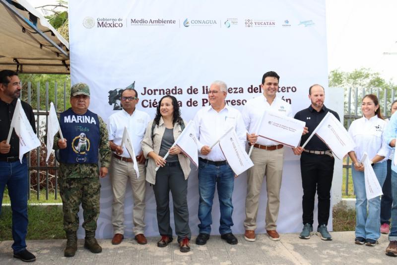 El evento fue encabezado por el director general del Organismo de Cuenca Península de Yucatán de la Conagua, José Luis Acosta Rodríguez, acompañado de la secretaria de Desarrollo Sustentable (SDS), Neyra Silva Rosado; el presidente municipal de Progreso, Erik José Rihani González; así como representantes de la Secretaría de Marina, la Procuraduría Federal de Protección al Ambiente (Profepa) y la Comisión Nacional Forestal (Conafor).